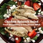 A chicken spinach salad combines seasoned chicken breasts with fresh spinach, strawberries, red onion, pecans, and feta cheese. The mix of savory chicken, sweet berries, crunchy nuts, and tangy cheese creates a balanced salad that works well for lunch or a light dinner.